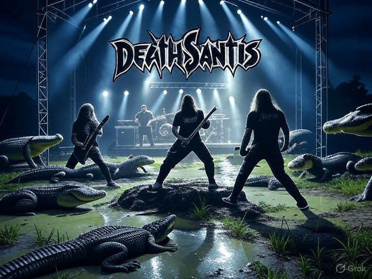 The statement 'Hell Yeah, Brother! Symphony of Leftist Destruction…' appears to be a lighthearted or humorous comment related to a fictional band named 'DeathSantis,' possibly referencing political or cultural themes. The conversation includes a discussion about music from different eras, comparing bands and albums. The tone seems to be casual and focused on music preferences rather than engaging in substantive public discourse.