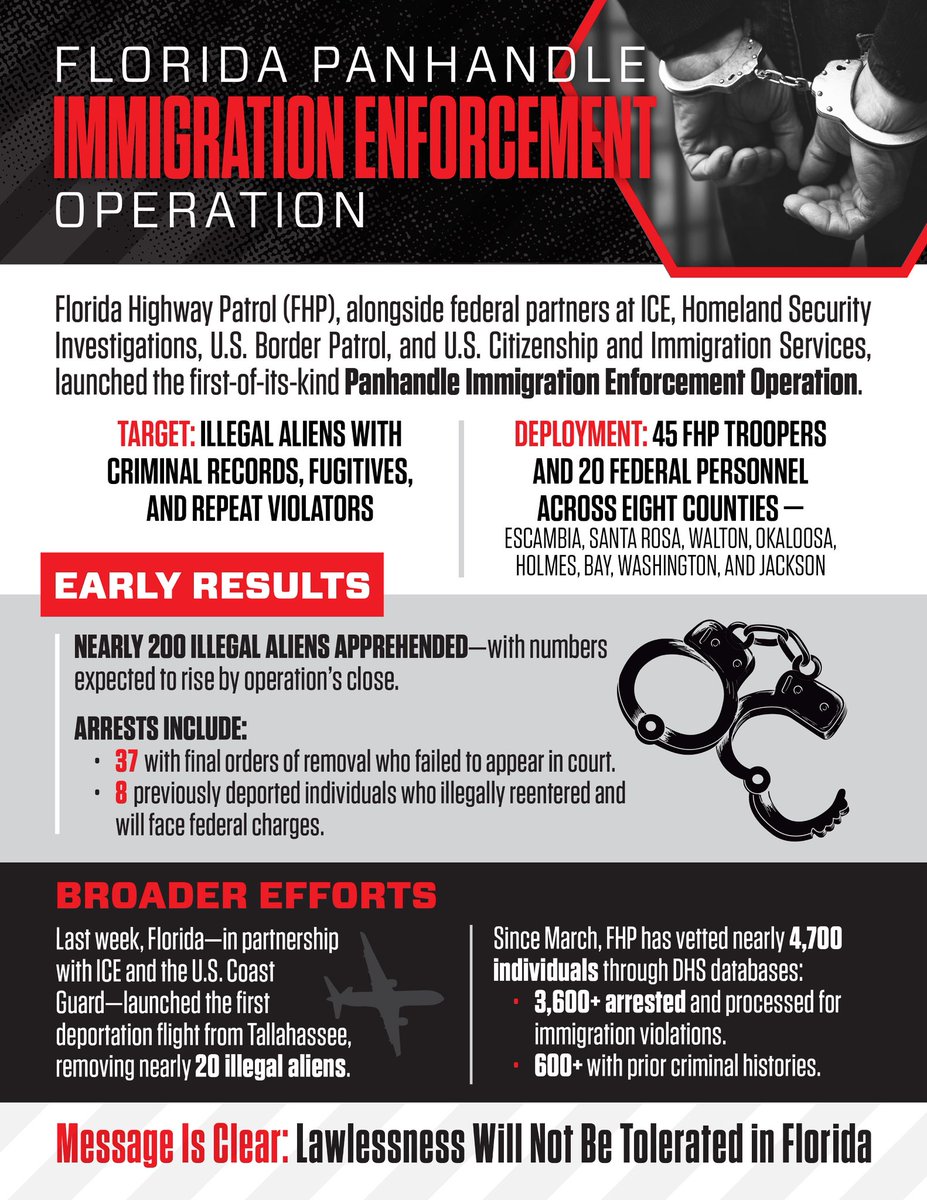 The statement discusses Florida's efforts to address illegal immigration, emphasizing law enforcement actions and coordination with federal agencies. It presents a strong stance on immigration enforcement, highlighting arrests and deportations.