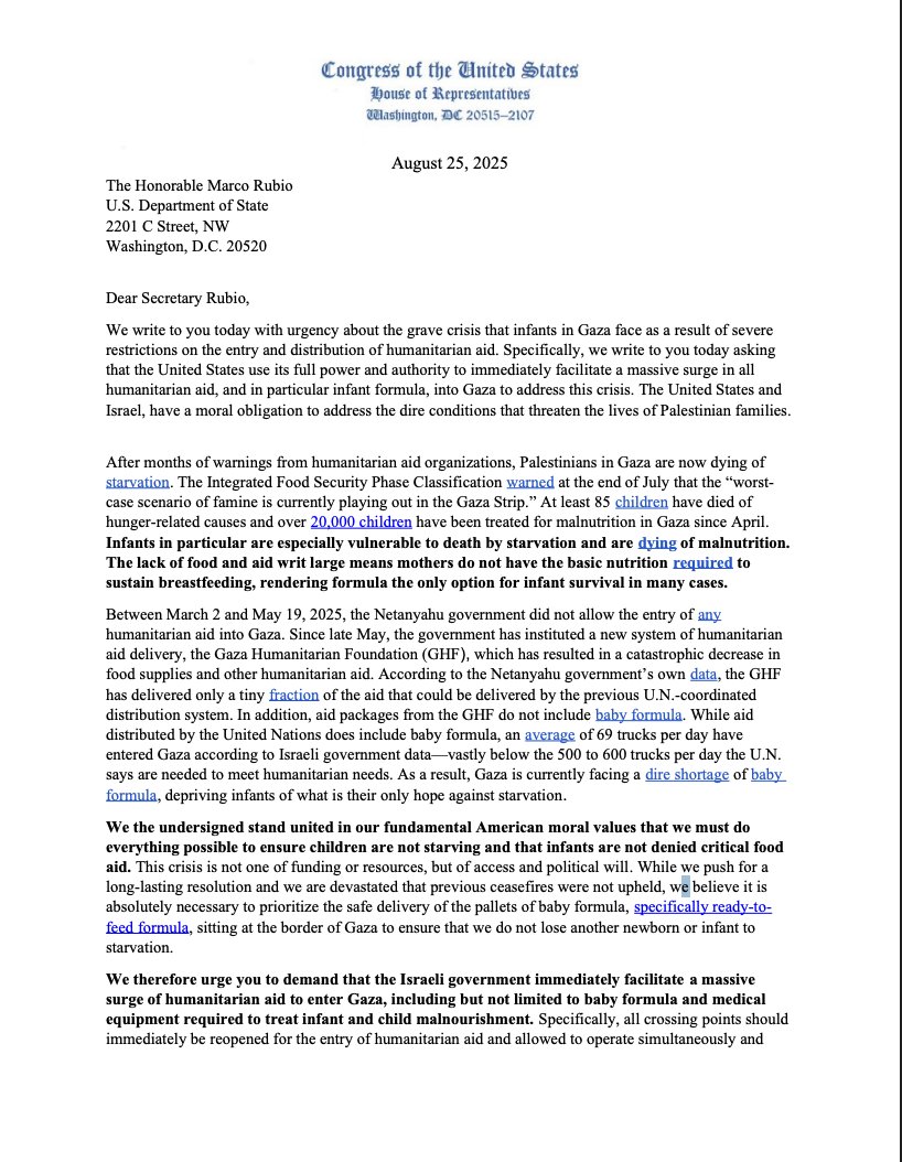 The statement and accompanying letter address a humanitarian crisis in Gaza, urging the U.S. and Israeli governments to provide aid, particularly baby formula, to alleviate starvation. It appeals to moral and legal obligations, highlighting the urgency of the situation and the need for immediate action.