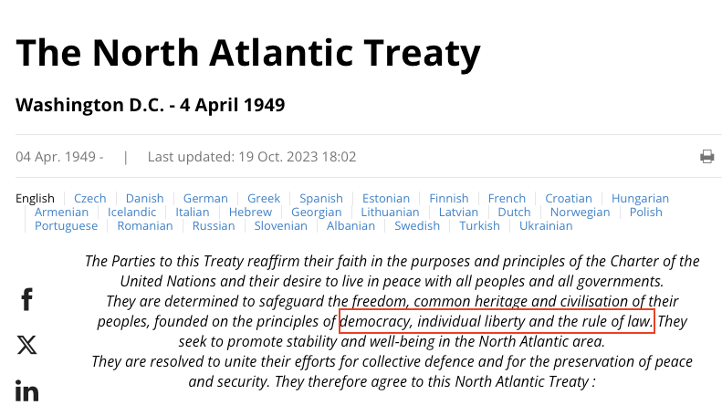 The statement claims a violation of the NATO Charter by a German Chancellor, suggesting interference in a mayoral election. It implies a breach of democratic principles, referencing the NATO Charter's emphasis on democracy and rule of law. The tone is accusatory and seeks to highlight perceived political manipulation.