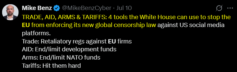 The statement and image engage in public discourse by discussing international relations and policy, specifically the EU's Digital Services Act and its implications for US-EU relations. The tone is confrontational, suggesting aggressive diplomatic and economic measures to counter the EU's regulations.