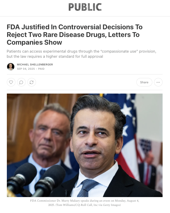 The statement critiques the FDA's decision-making process regarding drug approvals for rare diseases, suggesting that the agency is overly cautious and potentially hindering access to life-saving treatments. The accompanying images provide context for the FDA's decisions, highlighting concerns about trial heterogeneity, lack of meaningful treatment effects, and manufacturing deficiencies. The conversation involves public discourse on drug approval standards and patient access to experimental treatments.