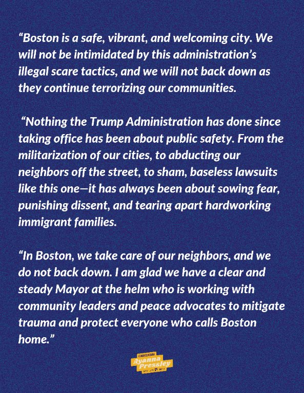 The statement is a critique of the Trump Administration's policies, particularly regarding public safety and immigration. It emphasizes Boston's resilience and community support, highlighting the city's leadership and commitment to protecting its residents.