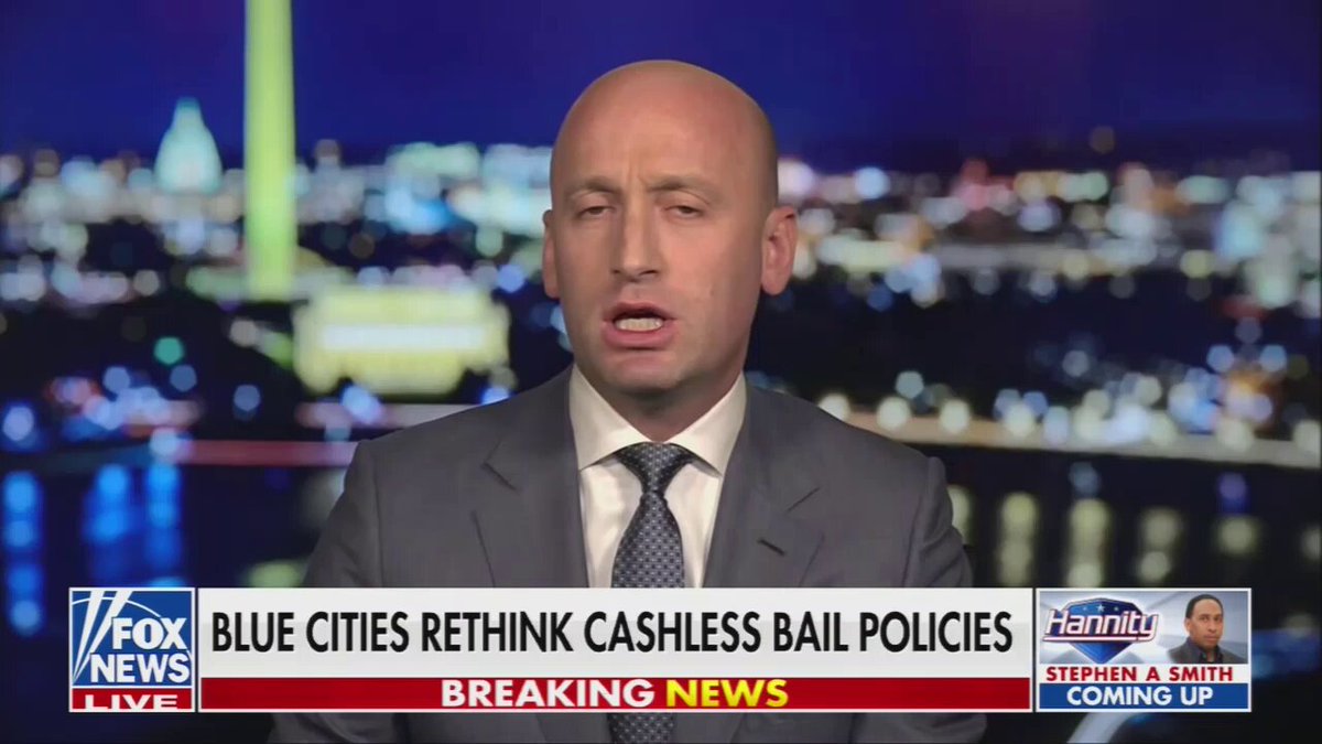 The statement is a lighthearted remark about Stephen Miller's speaking style, specifically his use of third person. It does not engage substantively with the public issue of cashless bail policies discussed in the image.