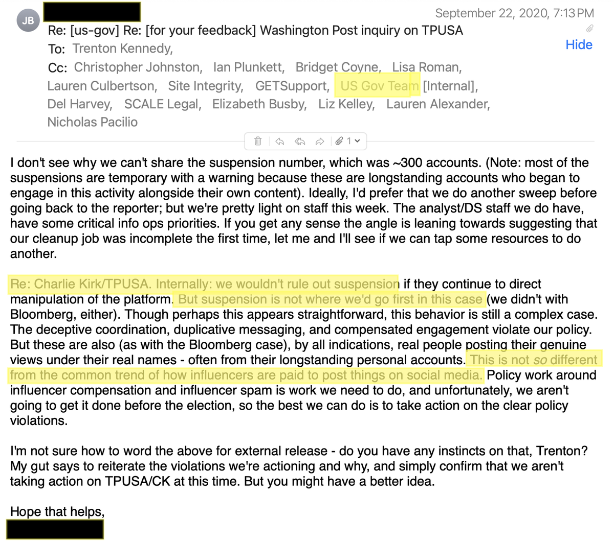 The statement discusses the decision-making process regarding account suspensions on social media platforms, comparing it to a previous incident involving Mike Bloomberg. It highlights the complexity of enforcing policies against deceptive practices while considering the genuine nature of some posts. The tone is analytical, focusing on policy enforcement and fairness.