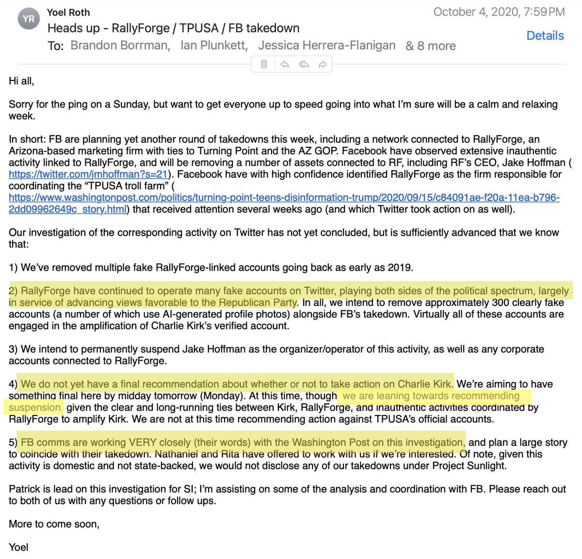 The statement and image discuss internal deliberations about suspending a Twitter account due to connections with inauthentic activities. The tone is factual and procedural, focusing on the investigation and decision-making process.