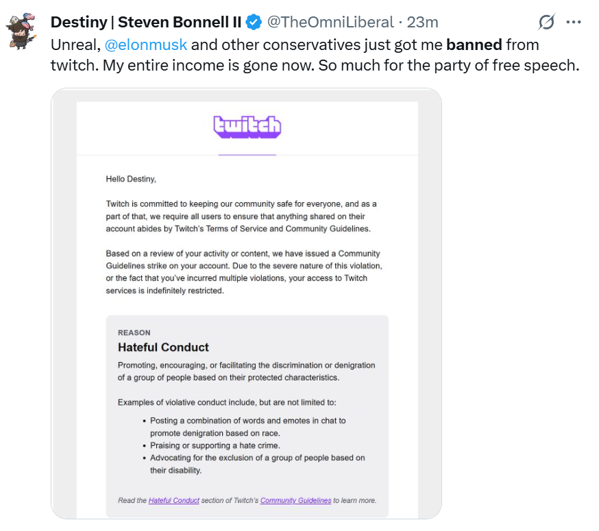 The statement involves a public discussion about a Twitch ban and its implications, touching on issues of free speech and platform policies. It questions the motives behind the ban and suggests it might be a PR stunt, which could be seen as engaging in public discourse.