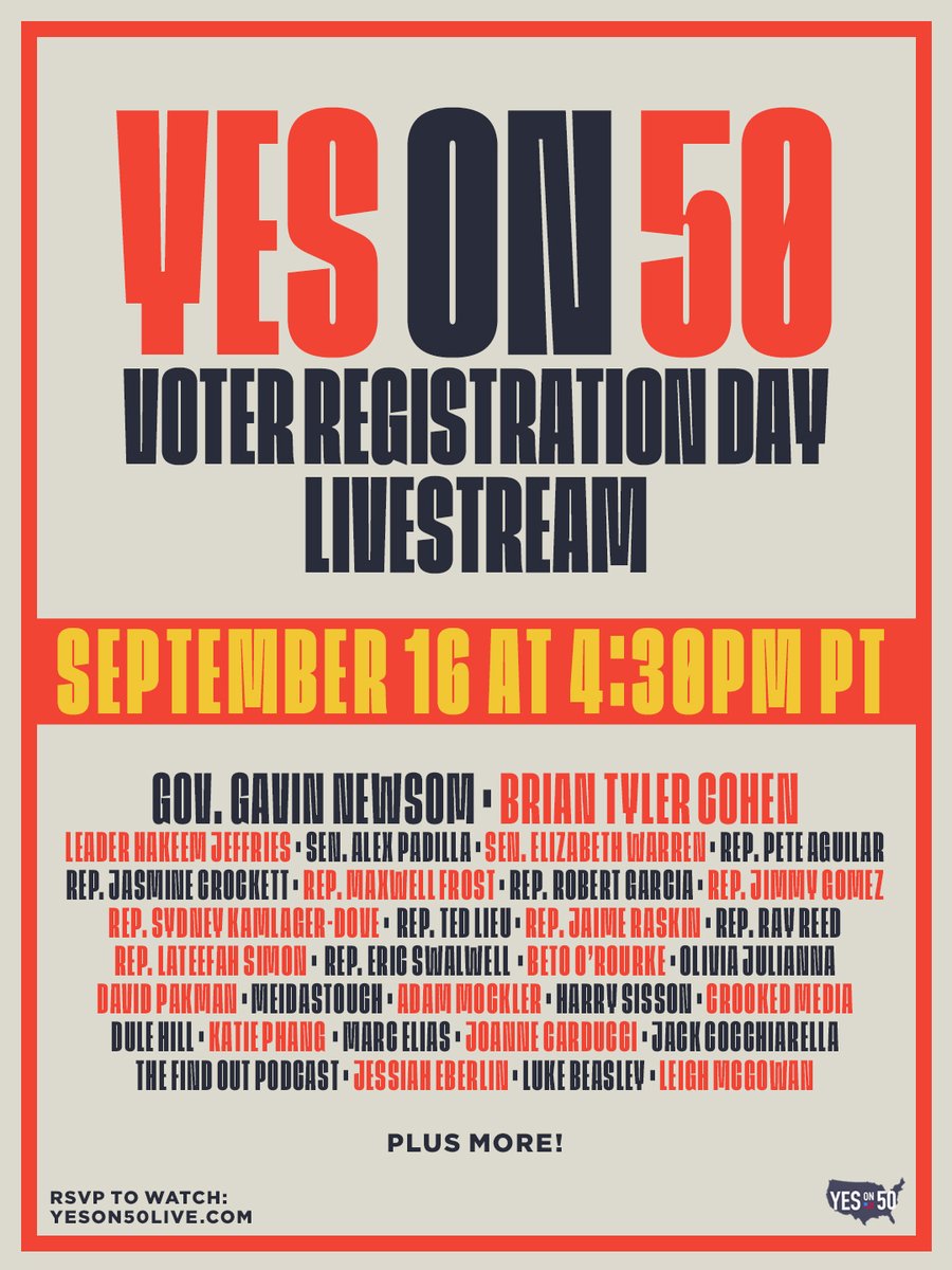 The statement is a call to action regarding a political issue, suggesting that a specific proposition (Prop 50) can prevent election rigging. It implies that a public figure is attempting to undermine democratic processes and promotes a livestream event to discuss this issue.