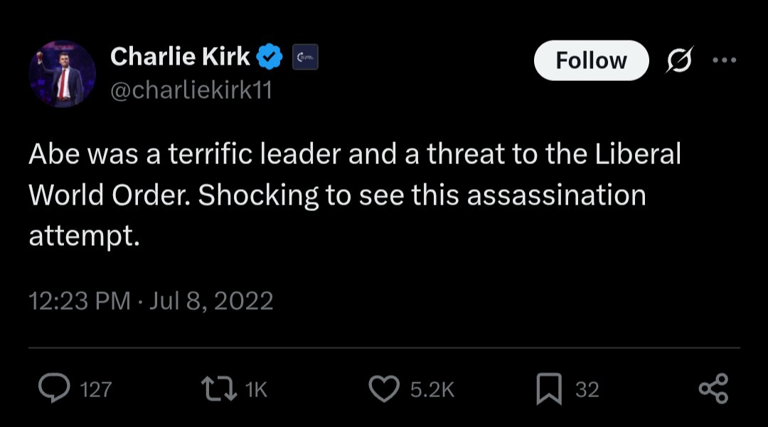 The statement 'Wow' is a brief reaction to a claim about Shinzo Abe's assassination being linked to his perceived threat to the 'Liberal World Order.' The original tweet by Charlie Kirk suggests a conspiracy theory, which can be a sensitive topic. The reply does not add substantive engagement or analysis to the discussion.