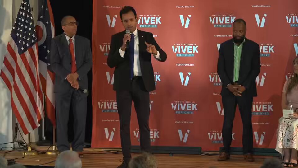 The image shows a political event with speakers on stage, likely discussing campaign-related topics. Without specific statements or context, it's unclear if public discourse principles are addressed.