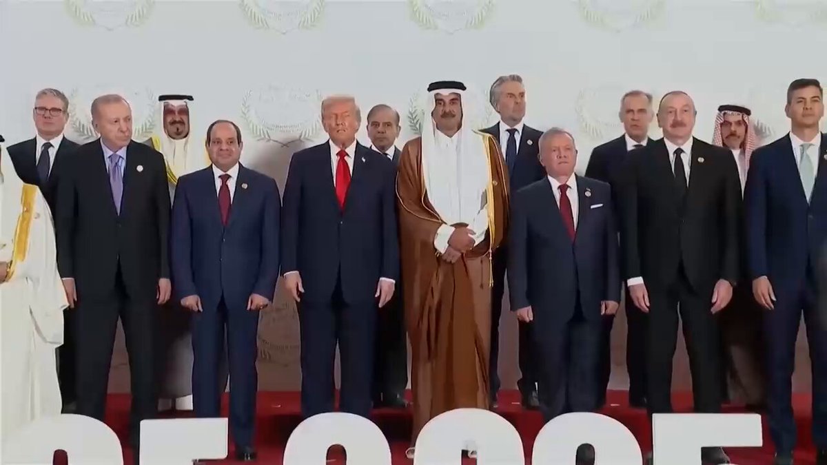 The statement 'Peace through American STRENGTH!' is a political assertion emphasizing the role of American power in achieving peace. It suggests a belief in the effectiveness of military or diplomatic strength as a means to secure peace. The context of the international Gaza Peace Summit implies a focus on international relations and conflict resolution.