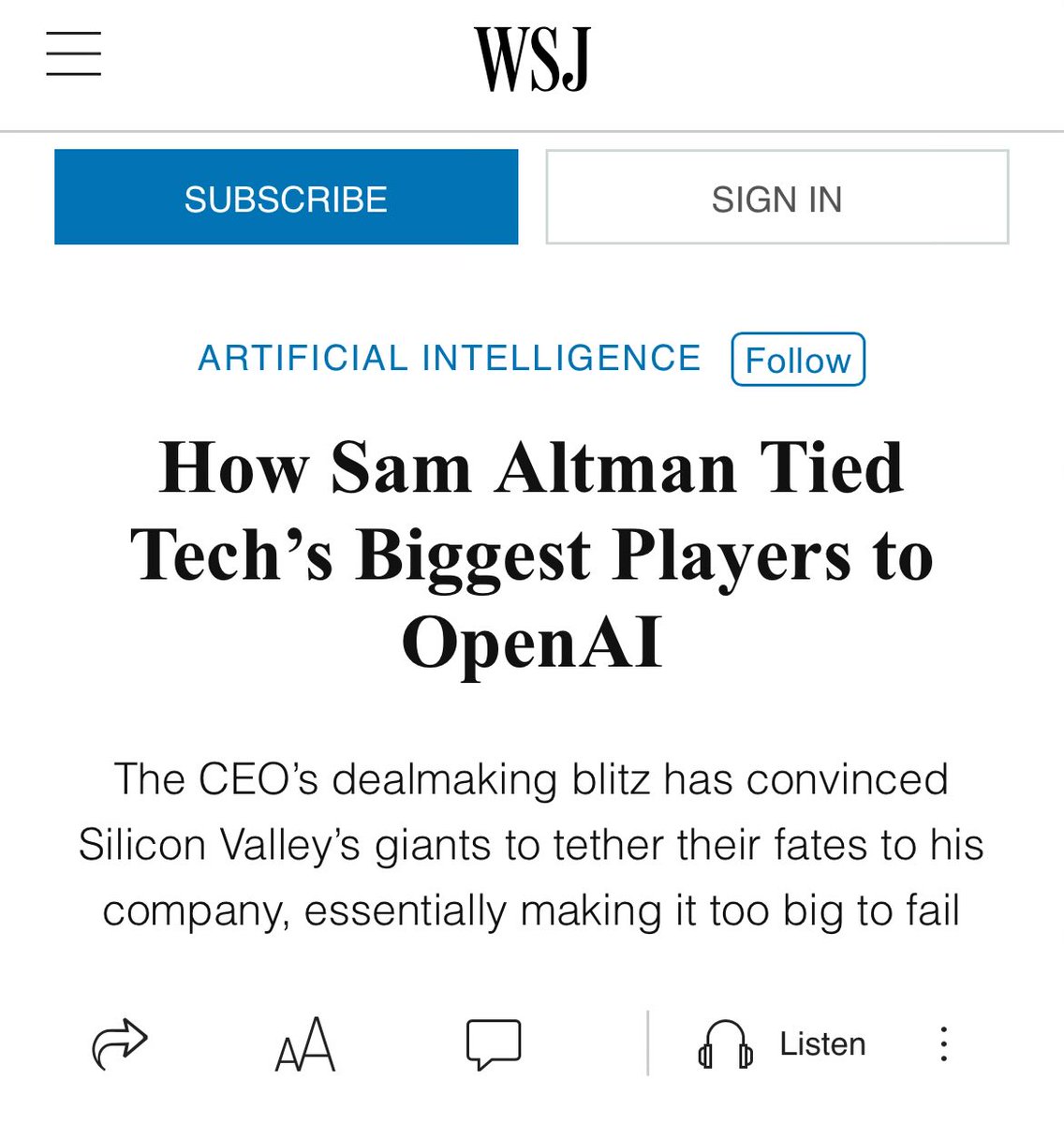 The statement questions the relevance of the 'Too Big to Fail' concept in the context of modern tech companies, referencing a headline about OpenAI's strategic partnerships. It engages with public discourse on corporate influence and economic stability.