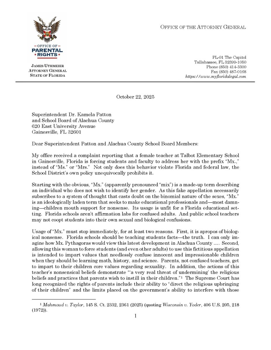 The statement and accompanying letter engage in public discourse by addressing the use of gender-neutral titles in schools, a topic related to educational policy and gender identity rights. The tone is dismissive and critical of the use of 'Mx.' as a title, framing it as a violation of law and policy.