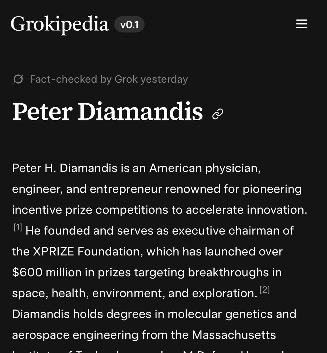 The statement is promotional in nature, highlighting Peter Diamandis's achievements and the Grokipedia platform. It does not engage in substantive public discourse or address societal issues.