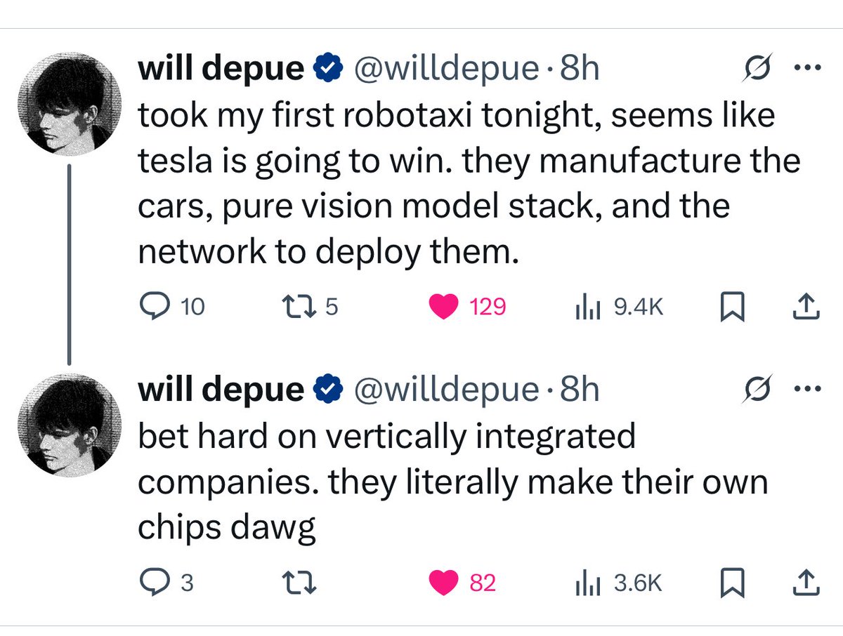 The statement 'Hardware is the end game' in response to a discussion about Tesla's potential success in the robotaxi market suggests a focus on the importance of hardware in technological advancements. The conversation revolves around Tesla's vertical integration and manufacturing capabilities, highlighting the strategic advantage of controlling hardware production. This discussion touches on public discourse related to technology and business strategy.