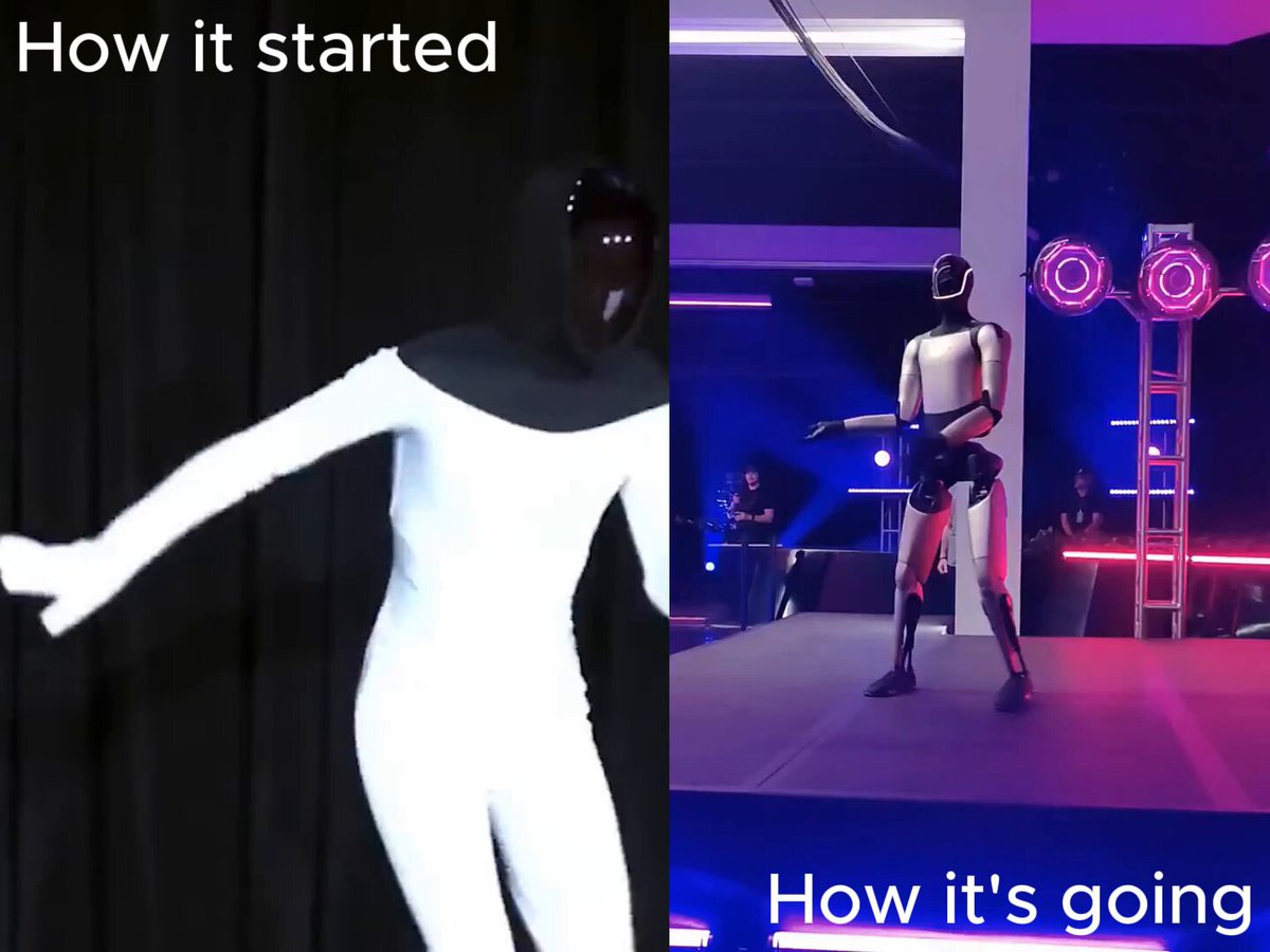 The image uses a popular meme format to humorously depict the progress of a humanoid robot. It contrasts an early stage with a more advanced stage, likely highlighting technological development. The tone is lighthearted and intended to entertain rather than engage in serious public discourse.