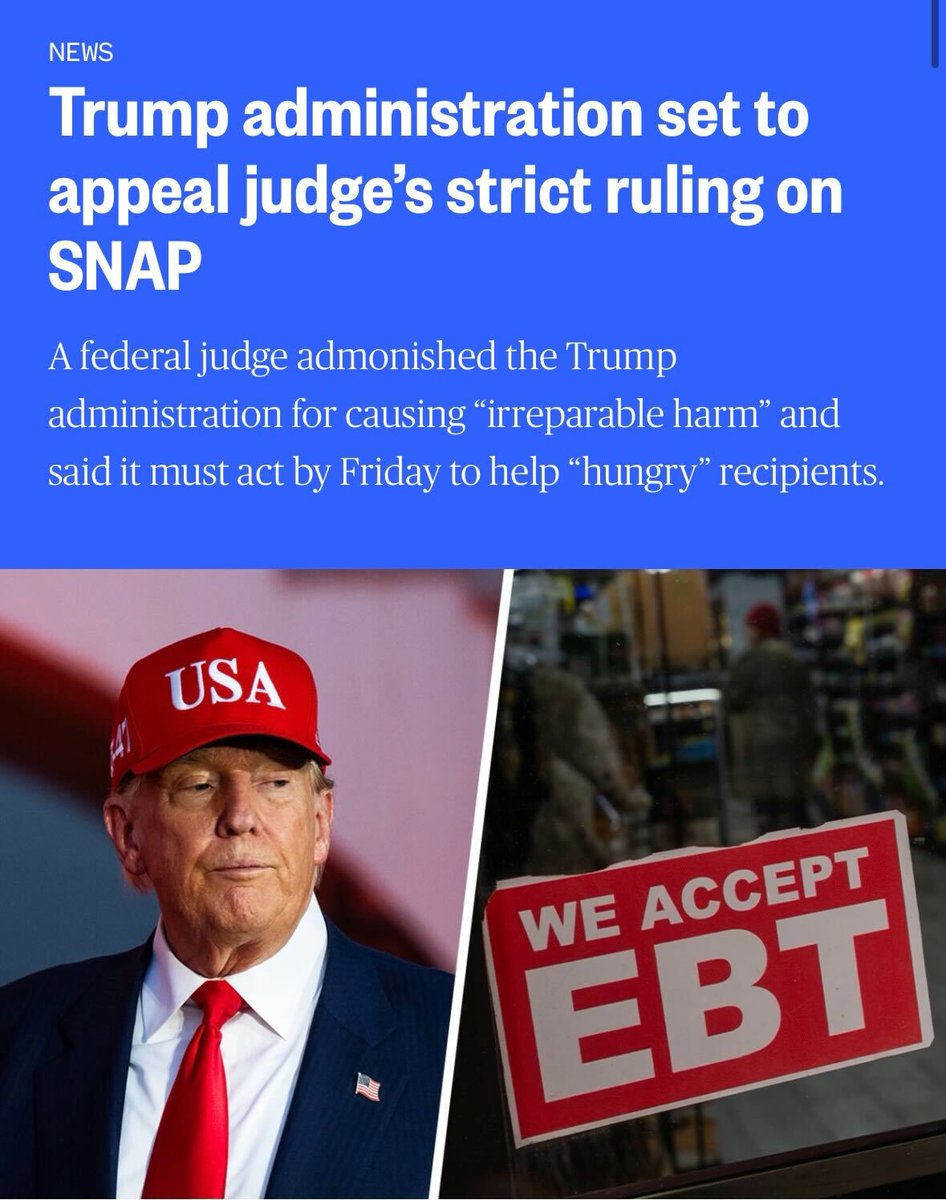 The statement criticizes the Trump administration's decision to appeal a court ruling related to food assistance, using strong language to express disapproval. It highlights a public policy issue concerning food assistance for families.