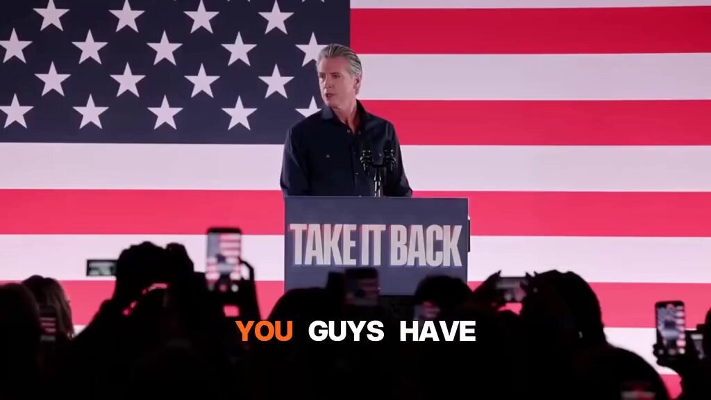 The statement and image describe a political rally by Gavin Newsom in Texas, aimed at critiquing Donald Trump's presidency. The tone is confrontational, emphasizing a political divide and rallying support against Trump.