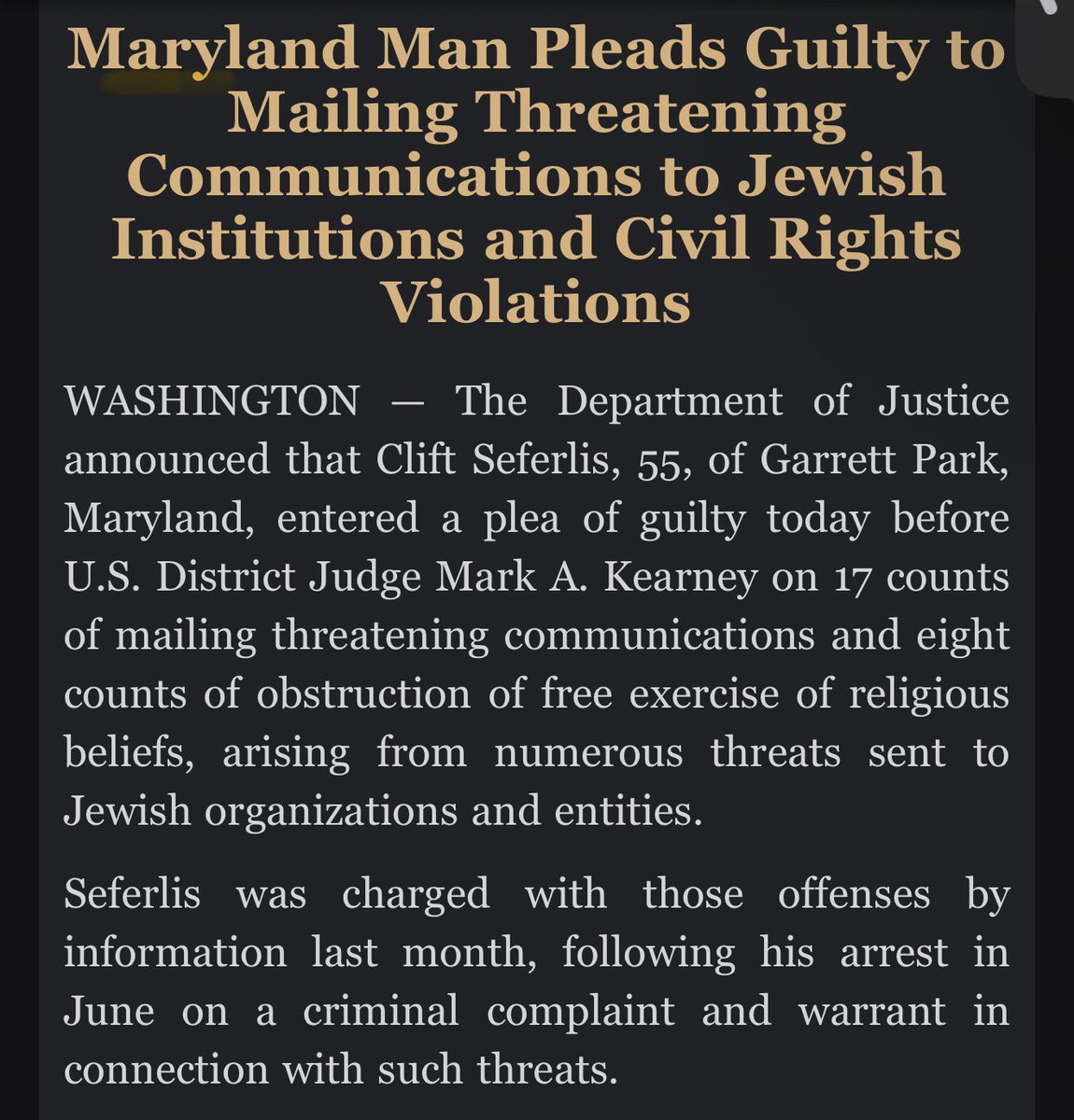 The statement reports on a legal case involving a man pleading guilty to mailing threatening communications to Jewish institutions, highlighting issues of civil rights violations and religious freedom. It is factual and informative, focusing on the legal proceedings and charges.