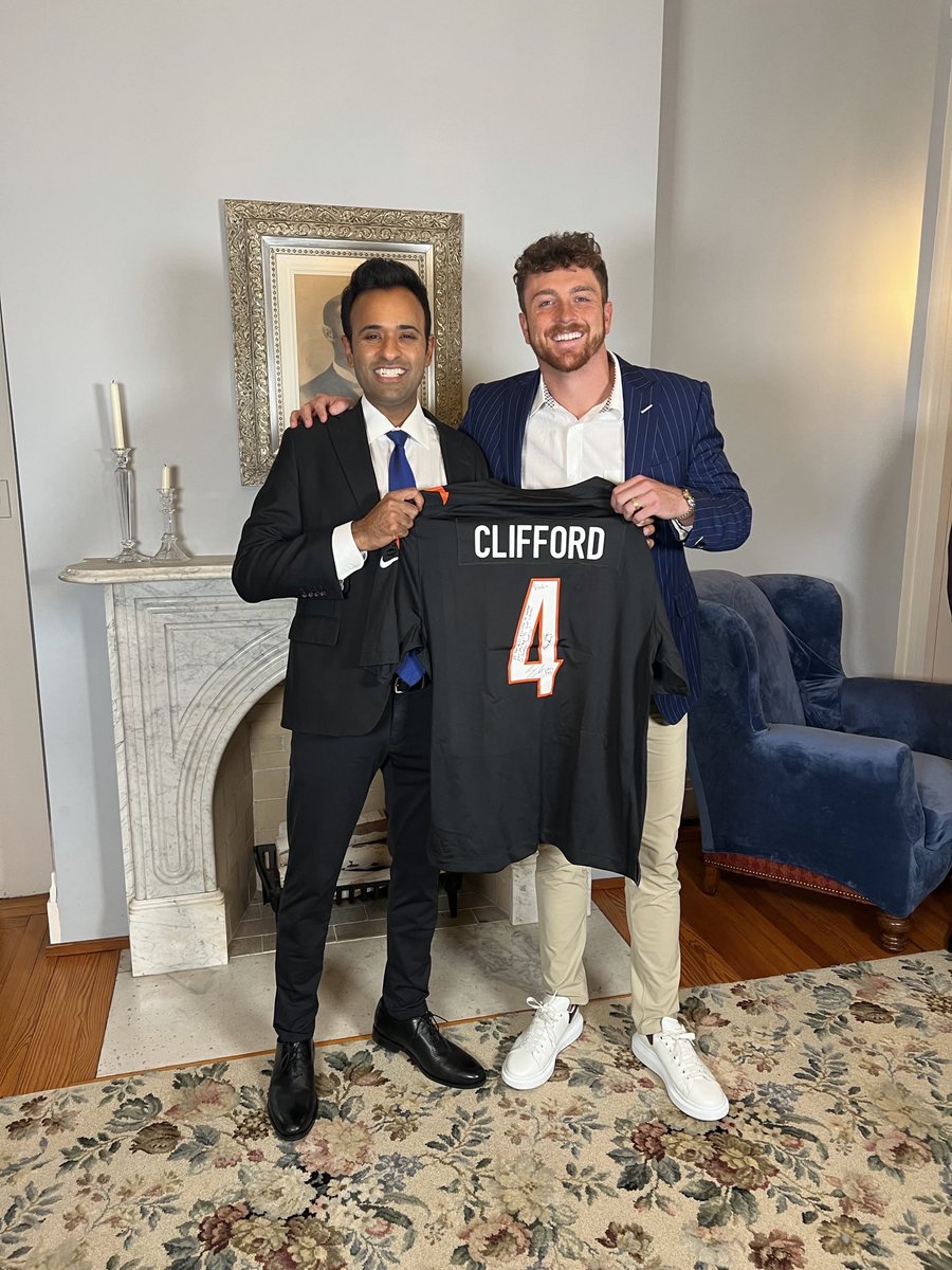 The statement is lighthearted and focuses on sports enthusiasm and personal connections. It expresses optimism for Ohio and the Bengals, and shares a positive interaction with a sports figure. The tone is supportive and celebratory, with no engagement in public issues or debates.