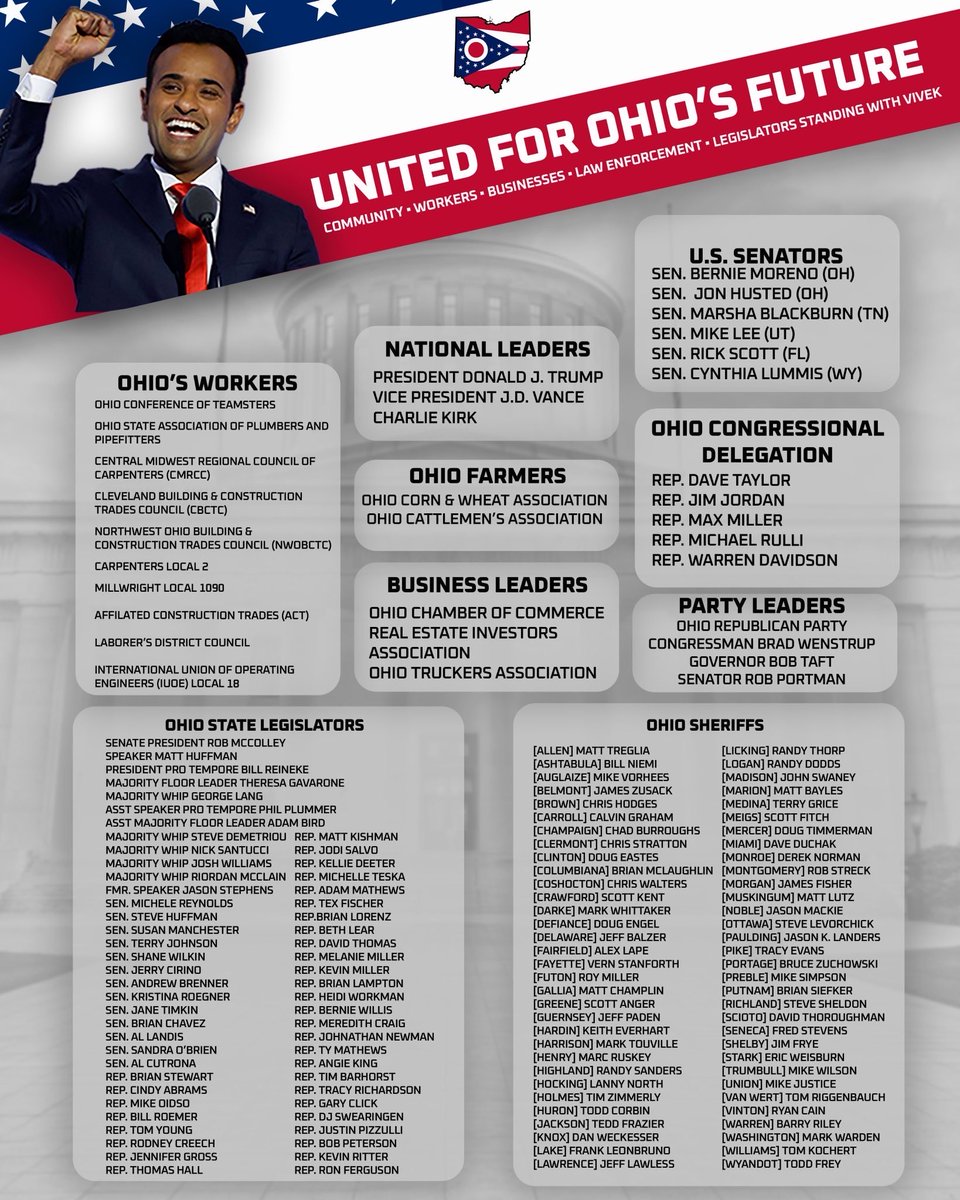 The statement and image promote political support for a candidate, highlighting a shift in allegiance from Democrats to a new direction. It emphasizes unity among various groups in Ohio, such as workers, business leaders, and legislators, to support this change.