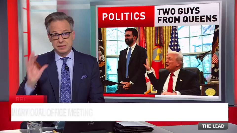 The statement refers to a meeting between Trump and Mamdani, described as a 'love fest,' which suggests a positive or amicable interaction. The tone appears to be lighthearted or possibly sarcastic, given the context of political discourse. The image shows a news segment discussing this meeting, indicating it is a topic of public interest.