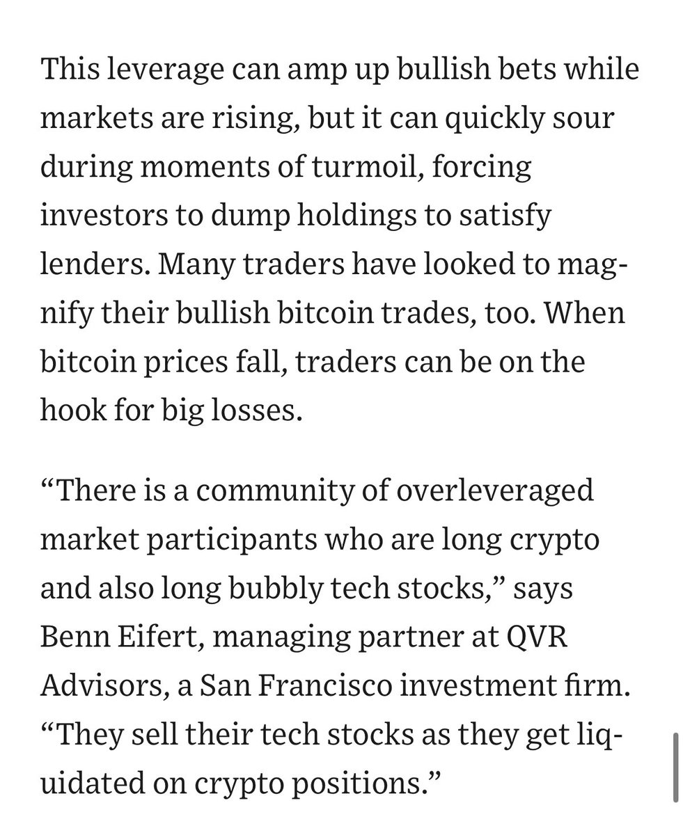 The statement expresses skepticism towards the behavior of individuals in the crypto and tech sectors, suggesting they are overleveraged and fearful. It references a quote from a reputable source to support this theory.