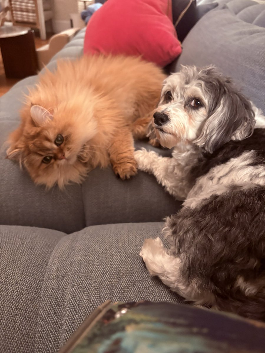 The statement is lighthearted and affectionate, showcasing a cat and a dog together. It does not engage in public discourse as it does not address any societal issues or public concerns.
