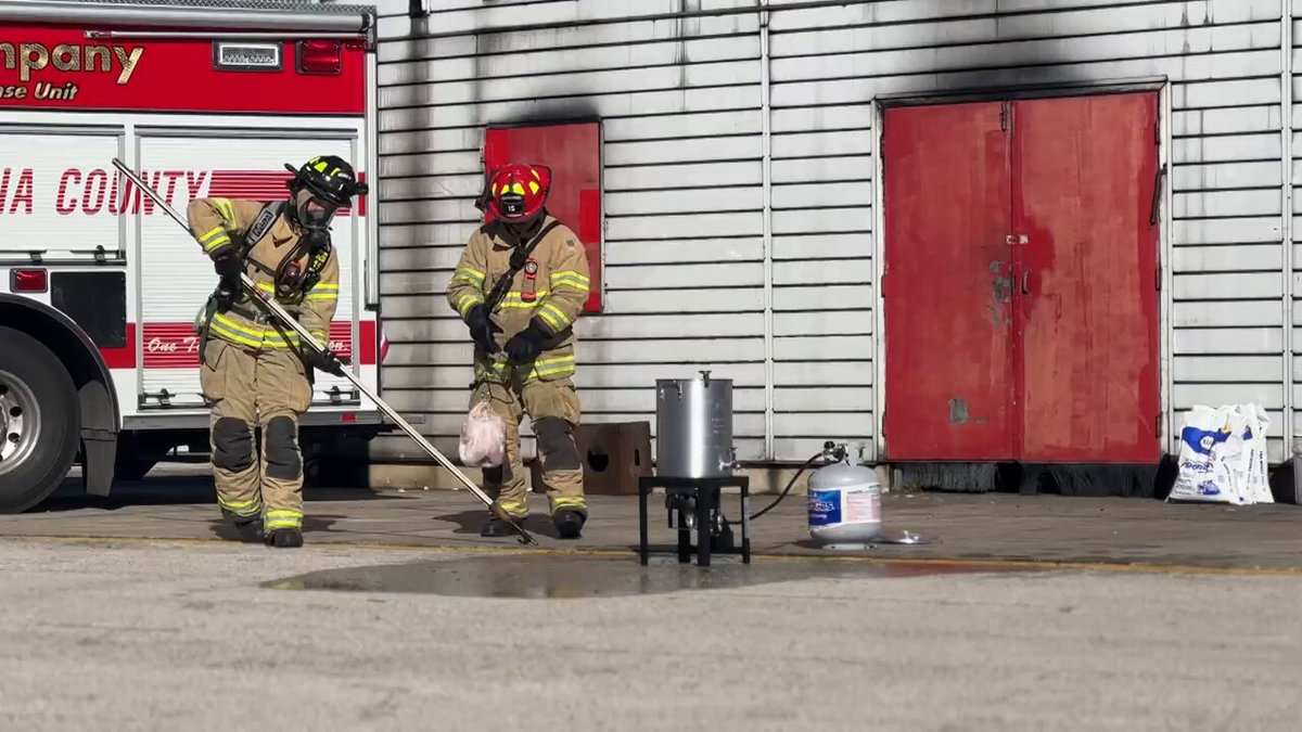 The statement 'Never tried that before…' is a lighthearted, conversational remark in response to a safety demonstration about deep frying a frozen turkey. It does not engage substantively with public issues or debates, and thus does not constitute public discourse.