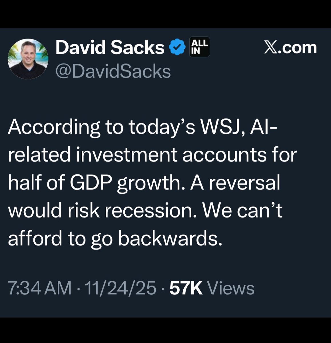 The statement and conversation engage in public discourse by discussing the economic impact of AI investments and potential risks of a financial bubble. The tone is critical and speculative, questioning the sustainability of AI-driven economic growth and the potential need for a bailout.