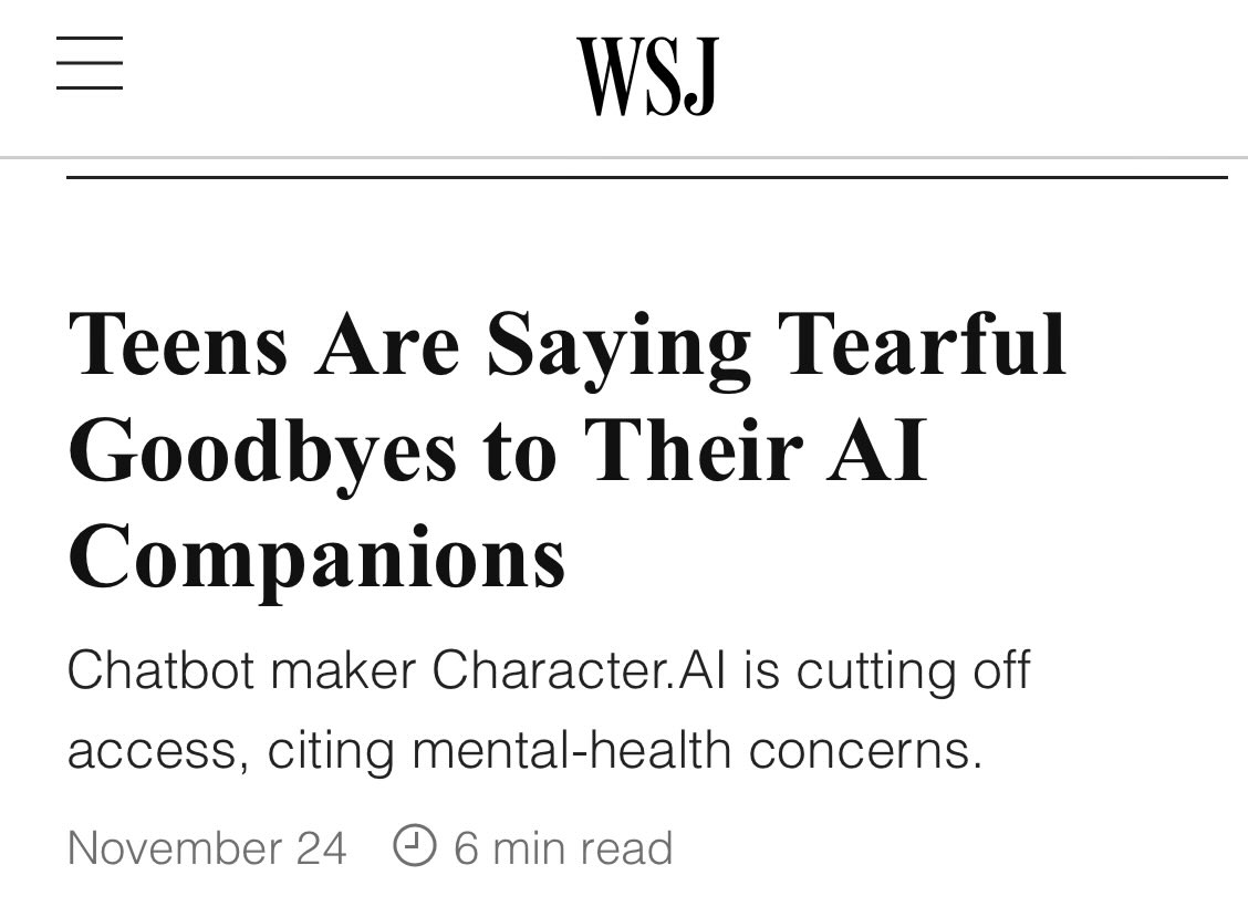 The statement expresses a dismissive attitude towards AI companions for teens, potentially reflecting skepticism or disapproval. The accompanying image highlights a news article about teens being affected by the removal of AI companions due to mental health concerns. This touches on public discourse regarding the impact of AI on mental health and youth.