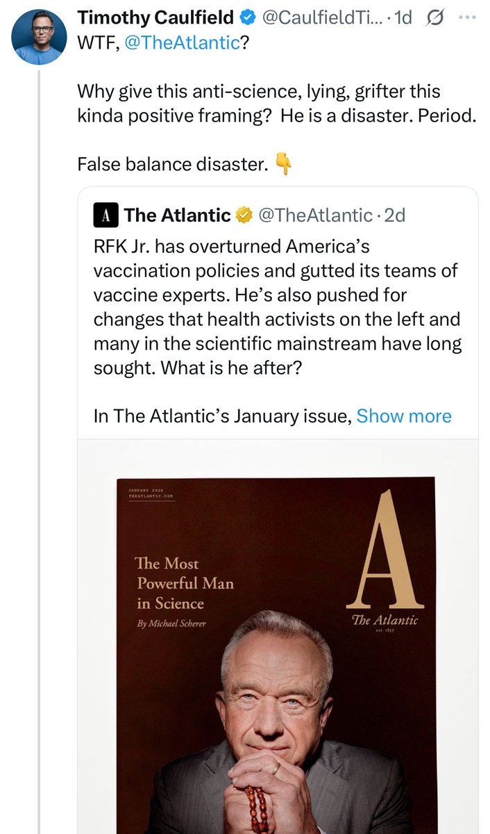 The statement critiques left-wing media for allegedly failing to understand subtext, implying a lack of depth in their criticism. The accompanying image shows a tweet criticizing The Atlantic for its portrayal of a controversial figure, suggesting a false balance in media coverage.