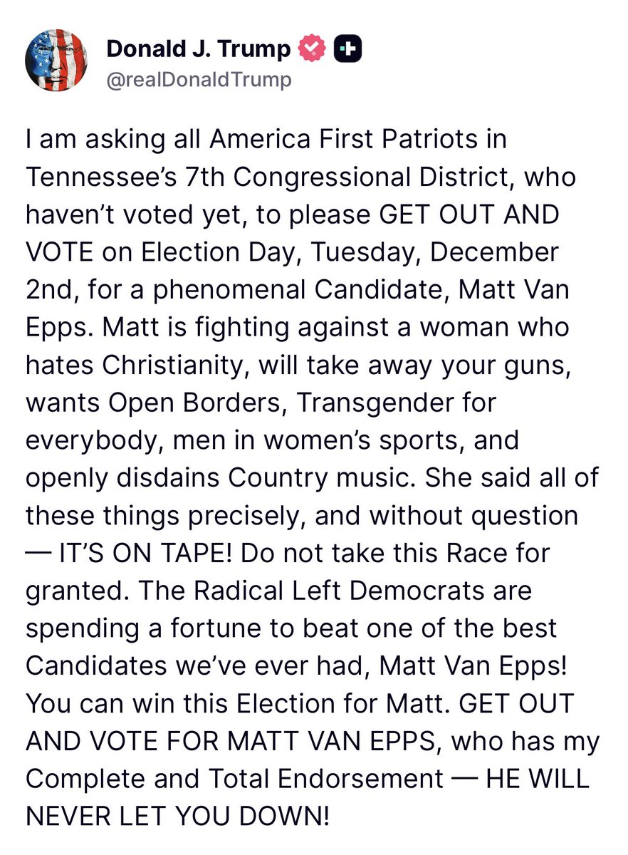 The statement is a political endorsement urging voters to support a candidate, Matt Van Epps, in an election. It uses strong language to criticize the opposing candidate and their policies, framing them negatively. The tone is assertive and partisan, aiming to mobilize voters by appealing to specific values and concerns.