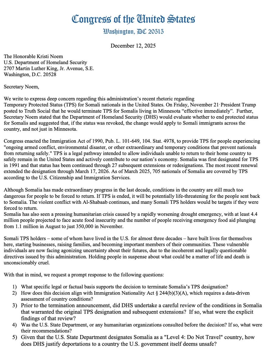 The statement and accompanying letter address the issue of Temporary Protected Status (TPS) for Somali nationals in the U.S., highlighting concerns about the administration's threats to terminate this status. The tone is assertive and seeks accountability from the administration, emphasizing the contributions of Somali TPS holders and the potential dangers of revoking their status.