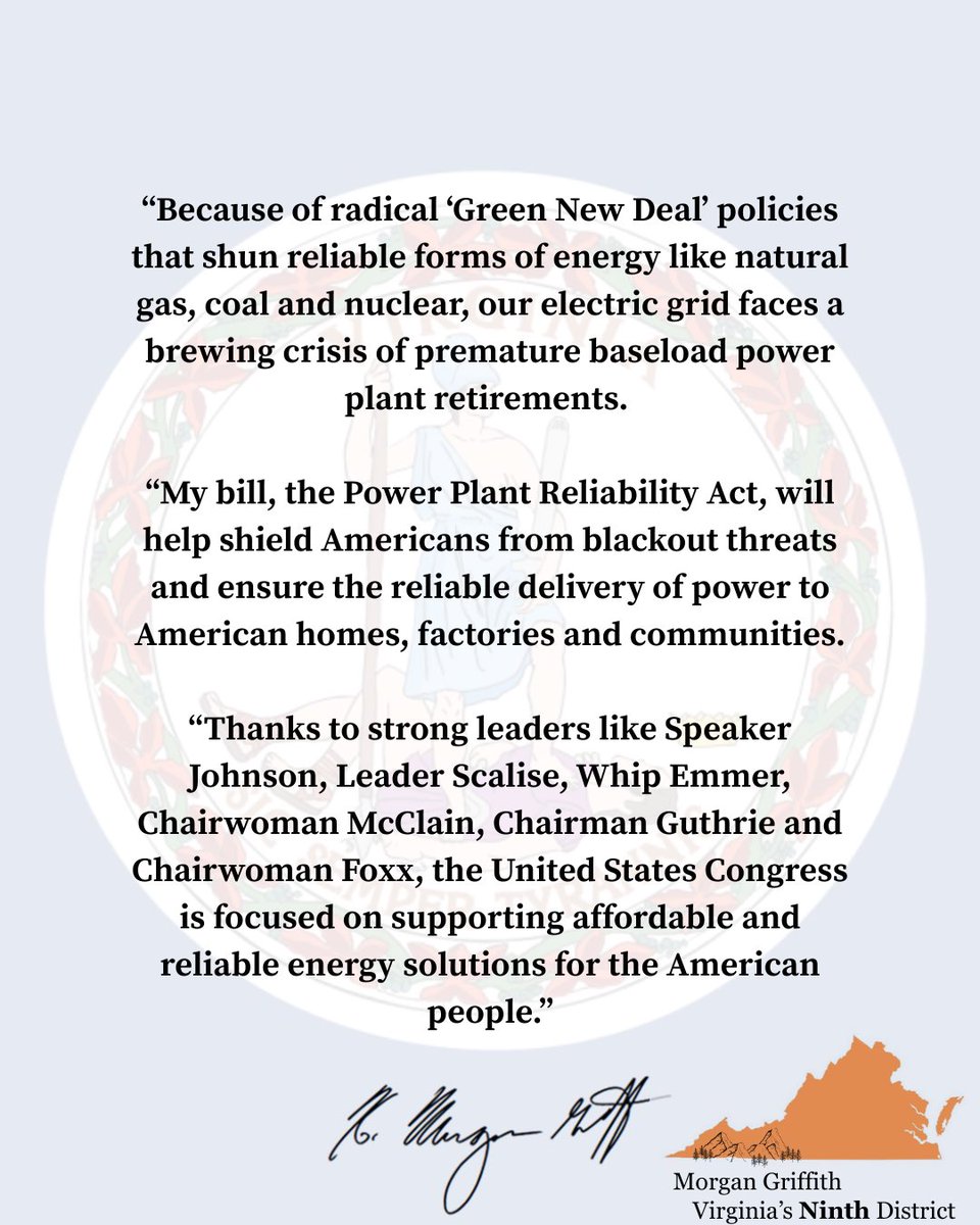 The statement discusses the passage of a bill related to energy policy, criticizing 'Green New Deal' policies and promoting the Power Plant Reliability Act as a solution for energy reliability. It praises certain political leaders for their support.