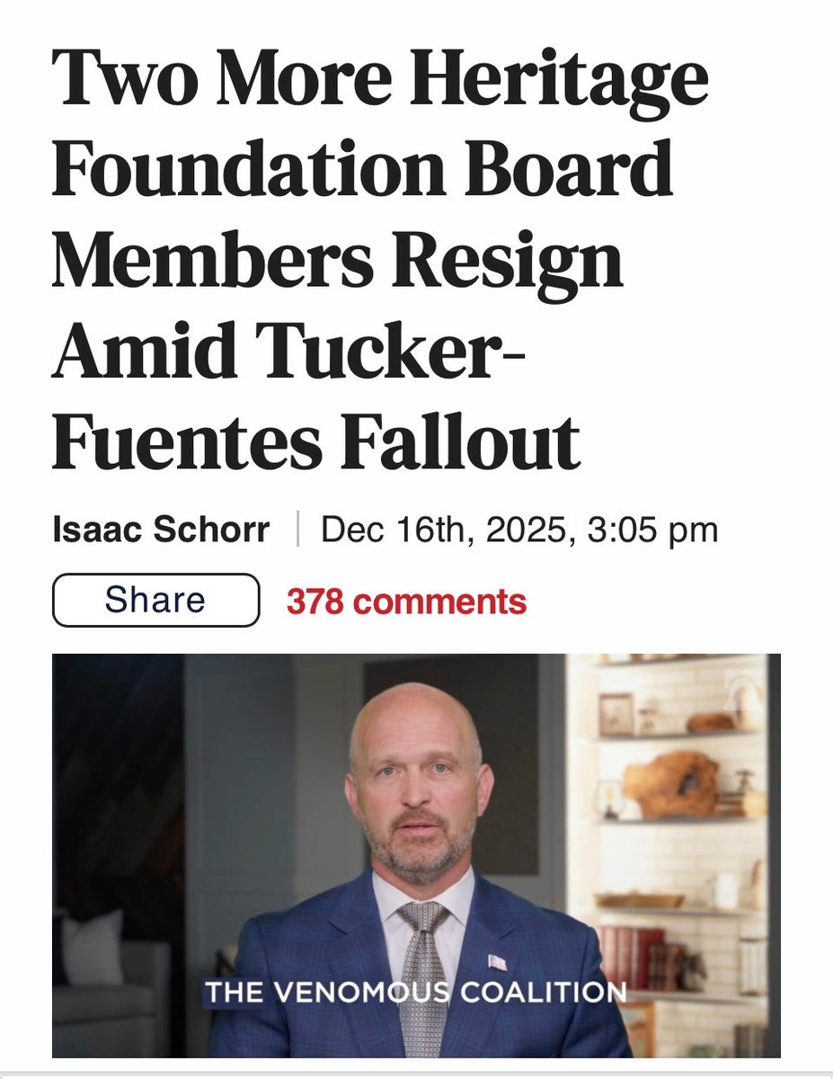 The statement and image address a public issue involving the resignation of board members from the Heritage Foundation, which is a topic of public interest. The tone is critical, using the term 'haemorrhaging' to suggest significant loss or decline. The image caption 'The Venomous Coalition' implies a negative view of the situation or individuals involved.