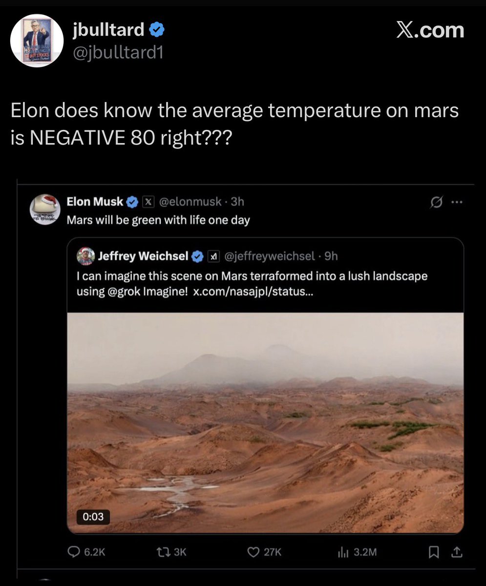 The statement is a lighthearted and humorous response to a conversation about Mars terraforming. It does not engage substantively with public issues or debates, but rather adds a playful tone to the discussion.