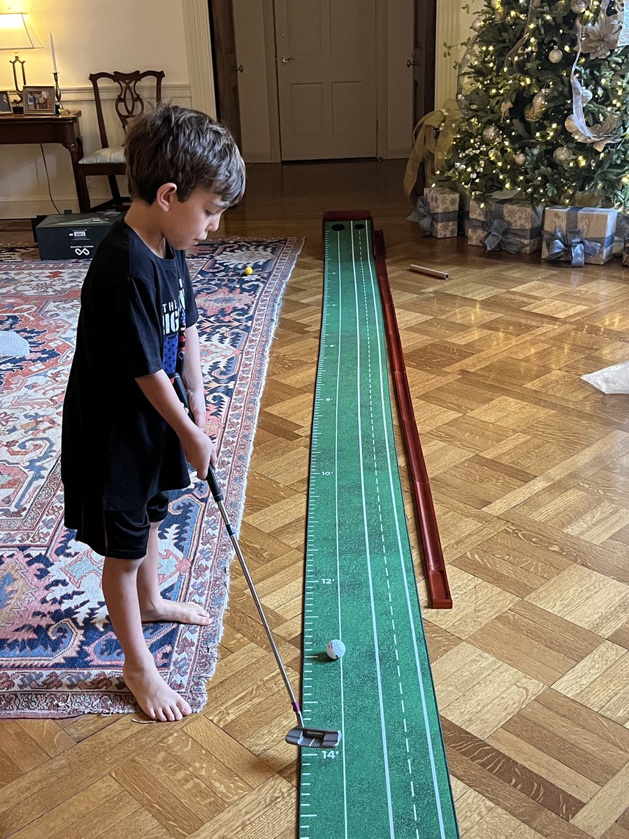 The statement and image appear to be promotional content for a putting training aid. It showcases a child using the product indoors, likely aiming to highlight its usability and appeal. The tone is neutral and focused on demonstrating the product's function.