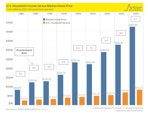 The statement comments on the growing disparity between median home prices and household income, suggesting it is unsustainable. It highlights a significant economic issue, contributing to public discourse on housing affordability.