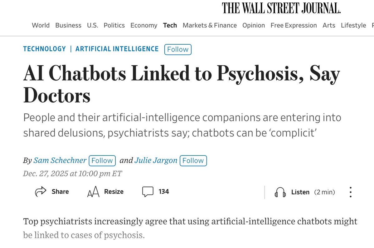 The statement critiques the societal reliance on AI companions, suggesting it reflects underlying issues. It references a headline linking AI chatbots to psychosis, implying potential harm. The tone is cautionary, raising concerns about mental health and technology's role.