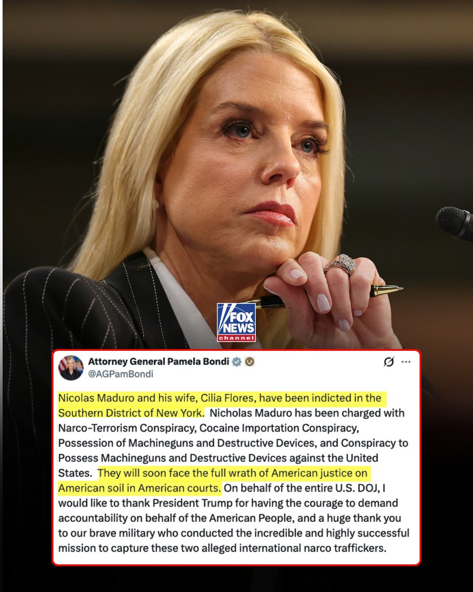 The statement is a formal announcement regarding the indictment of Nicolás Maduro and Cilia Flores, emphasizing the legal actions to be taken by the U.S. It uses strong language to convey the seriousness of the charges and the commitment to justice.