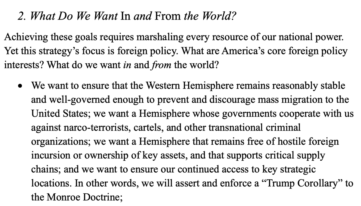 The statement outlines a strategic approach to U.S. foreign policy in the Western Hemisphere, emphasizing stability, cooperation against criminal organizations, and protection of strategic interests. It invokes the Monroe Doctrine and introduces a 'Trump Corollary' to assert American influence and security priorities.