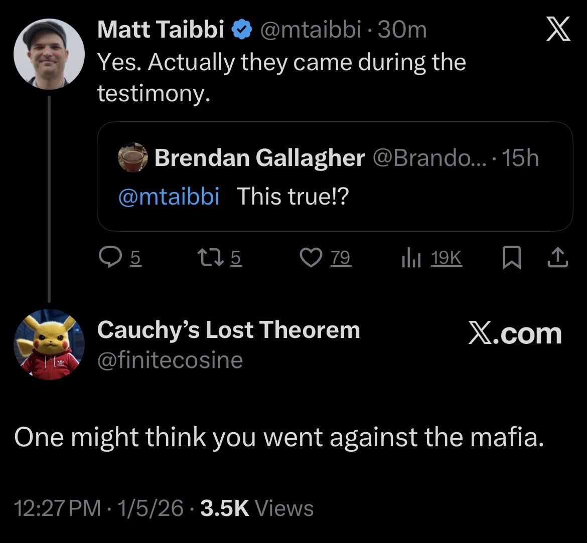 The conversation involves a discussion about a public figure's interaction with the IRS following a congressional testimony. The tone is inquisitive and slightly humorous, with a reference to the mafia suggesting a dramatic or conspiratorial angle. The statement by @finitecosine ('Yes, sorry') is a simple acknowledgment, likely addressing a misunderstanding or error in the conversation.