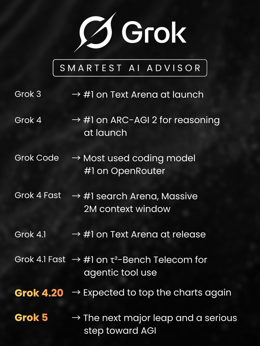 The statement and image focus on the achievements and progress of Grok, an AI advisor, throughout 2025. It highlights various milestones and rankings achieved by different versions of Grok. The tone is promotional and celebratory, emphasizing success and future potential.