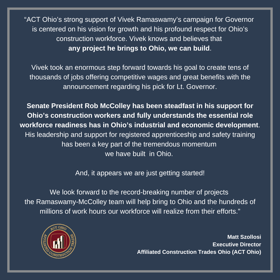 The statement expresses support for a political campaign, highlighting the candidates' commitment to Ohio's construction workforce and economic development. It emphasizes job creation, competitive wages, and workforce readiness, aiming to promote understanding and support for the candidates' vision.