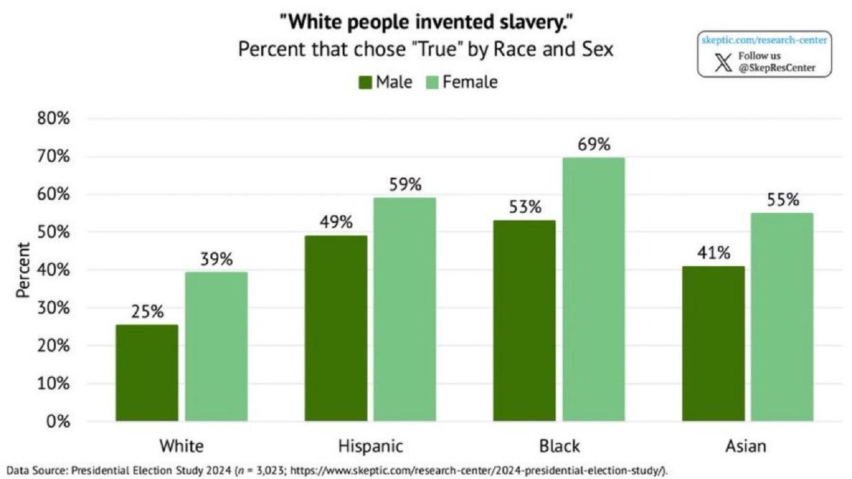 The statement addresses the historical narrative of slavery, suggesting that education on the topic is inaccurate and emphasizing the role of White people in ending slavery. It implies a need for a more nuanced understanding of history but may oversimplify complex historical events.