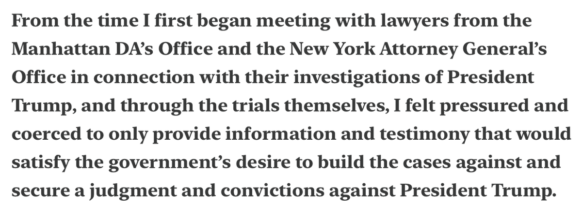 The statement and accompanying images discuss Michael Cohen's alleged change in stance regarding his testimony against Donald Trump, suggesting coercion by legal authorities. The tone is critical and somewhat mocking, implying a reversal in Cohen's position and questioning the integrity of the legal process.