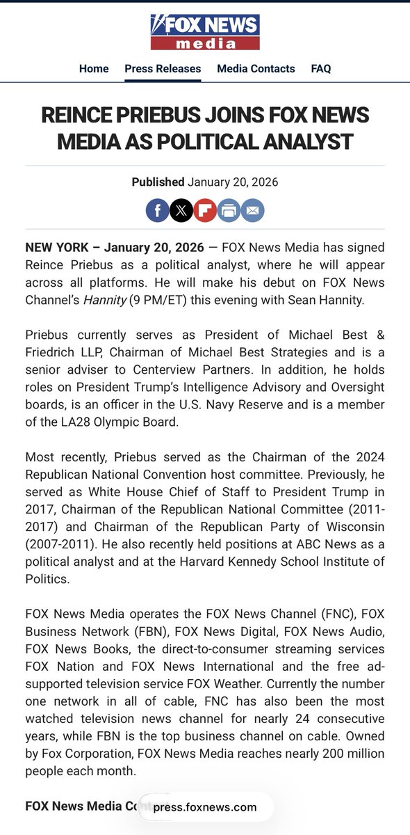 The statement 'Welcome aboard Reince' is a lighthearted and welcoming message in response to Reince Priebus joining Fox News as a political analyst. It does not engage in substantive public discourse or address societal issues.