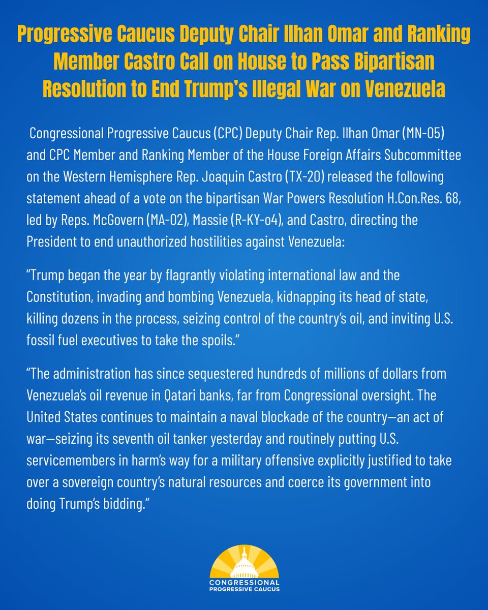 The statement is a political call to action urging Congress to pass a resolution to end what is described as an illegal war on Venezuela. It criticizes the administration's actions and emphasizes the need for Congressional authority over war decisions.