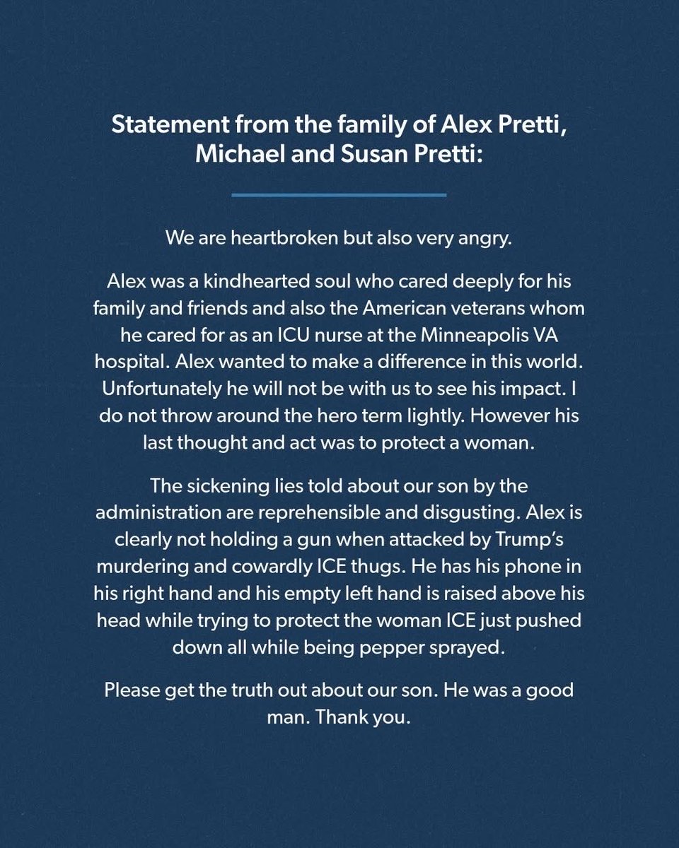 The statement from the family of Alex Pretti expresses grief and anger over the circumstances surrounding Alex's death. It accuses the administration of spreading lies and criticizes ICE agents, describing them as 'murdering and cowardly.' The statement calls for the truth to be revealed about Alex, portraying him as a hero who died protecting a woman.